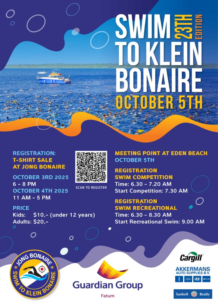 The 23rd Swim to Klein Bonaire returns on October 5th, starting with the exciting competition at Eden Beach, organized in collaboration with Jong Bonaire. A total of 58 swimmers joined last year’s race, making it a thrilling showcase of splashing strokes and endurance, with trophies and prizes provided by local partners.